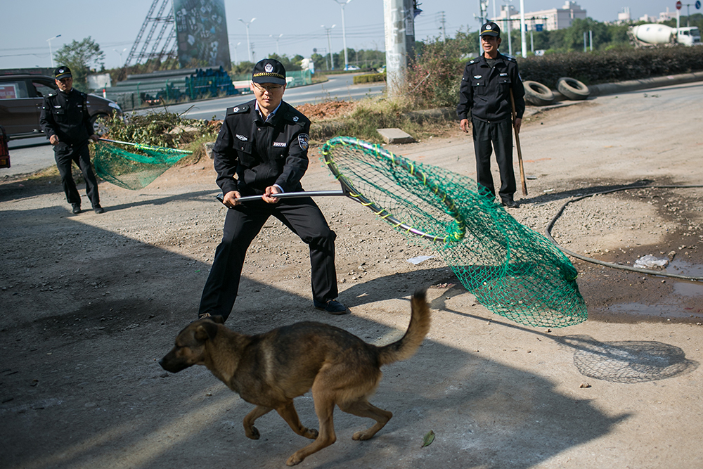 2014年11月5日,浙江金华,吕敏翔(中)尝试用网兜捕捉一只无证犬,准备将其送往集中收容中心,由于“经验”不足,这只狗最终逃脱了收捕。今年大学刚毕业的吕敏翔,被金华市金东区人民检察院录用,成为一名新任公务员。10月中旬开始,吕敏翔当上一名“城管义工”,进行为期半个月的挂职体验式实践锻炼。