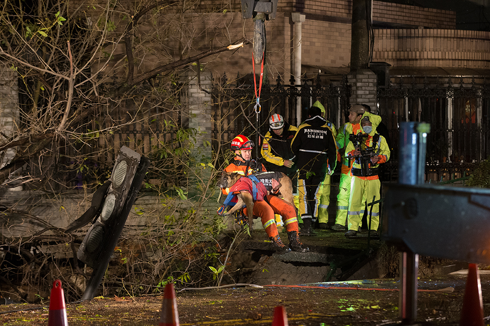 2020年12月30日凌晨,杭州,西溪路塌陷现场,一名抱着搜救犬的救援人员被吊入塌陷坑内参与救援。12月29日19时左右,西溪路庆丰新村段人行道突发地面塌陷,造成两名女大学生坠落,最终不幸遇难。