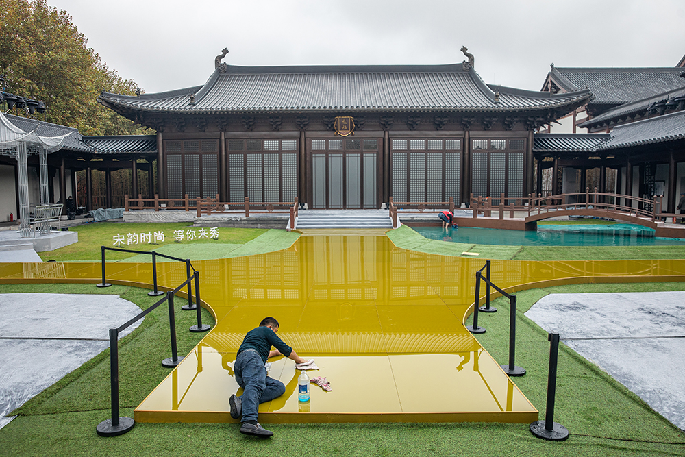 2022年11月18日,南宋德寿宫遗址博物馆,一名工作人员在慈福宫前擦拭活动舞台的地面。当天,南宋德寿宫遗址博物馆举行开馆仪式,该馆是国内首个系统阐释南宋历史文化全貌并原址原貌复原展示南宋皇家宫殿形式保护厅棚的场馆。