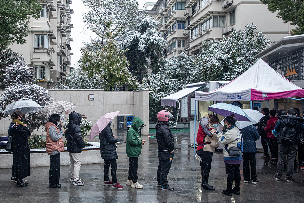 2022年12月1日,杭州迎来入冬初雪,一处核酸检测服务点,市民们冒雪排队,接受常态化核酸检测采样。