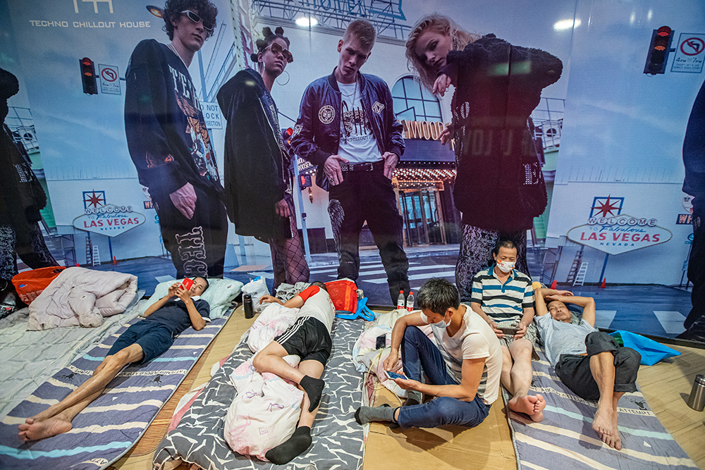 2022年9月14日,杭州大厦中央商城台风临时安置点,附近工地的建筑工人们被转移到这里安置休息。当天,台风“梅花”在浙江舟山普陀沿海登陆,登陆时中心附近最大风力14级(强台风级)。