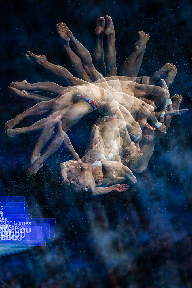 2023年10月4日,杭州亚运会跳水男子10米台决赛,中国选手杨昊在最后一跳惊艳发挥,拿到103.60分全场最高分,夺得金牌(多重曝光拍摄)。至此,第19届杭州亚运会跳水项目比赛全部结束,中国体育代表团连续13届亚运会包揽跳水项目的所有金牌。