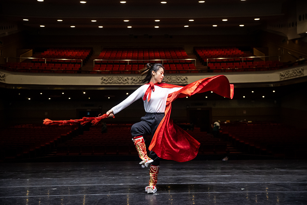 2023年12月9日,浙江宁波,越剧《白兔记》开演前,越剧演员陈丽君在舞台上走台排练。女子越剧诞生百年之际,浙江小百花越剧团的环境式越剧《新龙门客栈》火了,“90后”女小生陈丽君也随之“出圈”,成为网友口中的“顶流”。