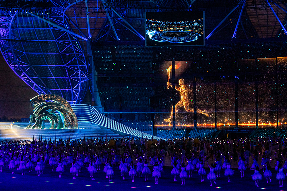 2023年9月23日,因新冠肺炎疫情延期一年举办的杭州第19届亚运会开幕。来自全球超1亿人组成的一个“数字人”火炬手,在钱塘江上踏浪而行,奔向主体育场“大莲花”,并点燃亚运圣火。这是亚运史上首次采用数字技术,在虚拟空间完成传递,又在真实世界点燃主火炬。