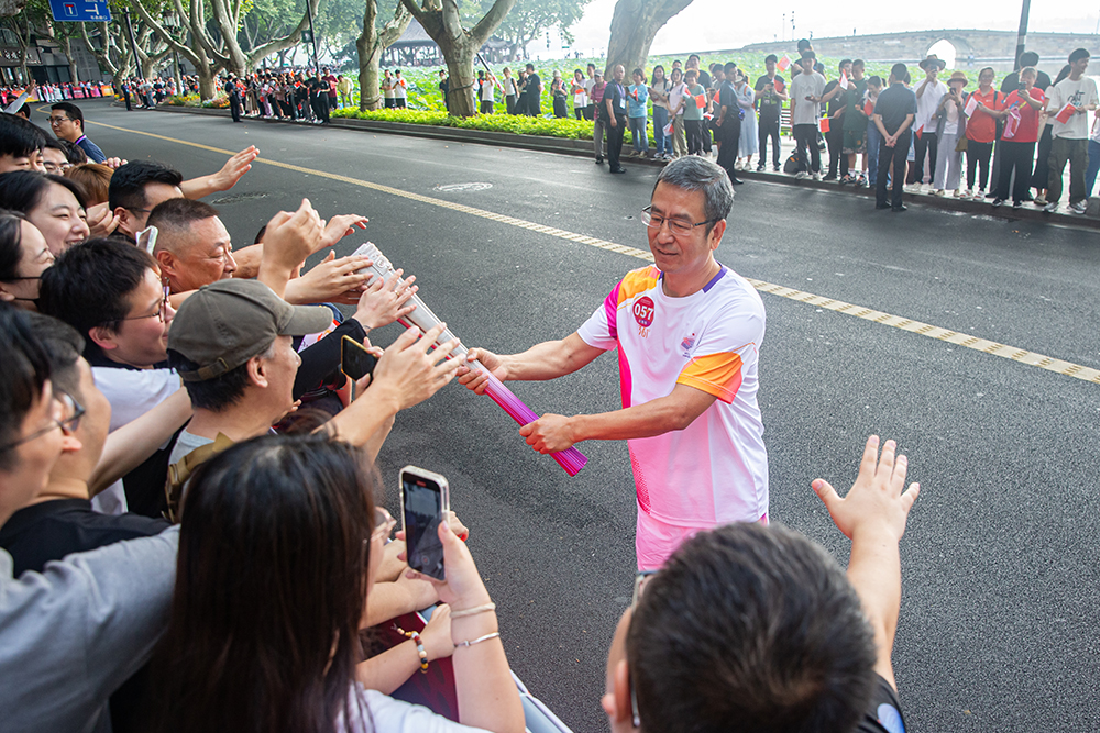 2023年9月8日,杭州第19届亚洲运动会火炬传递在杭州启动,西湖边断桥旁的北山街,火炬手白岩松将火炬递给马路两边的市民触摸,共享亚运喜悦和荣光。