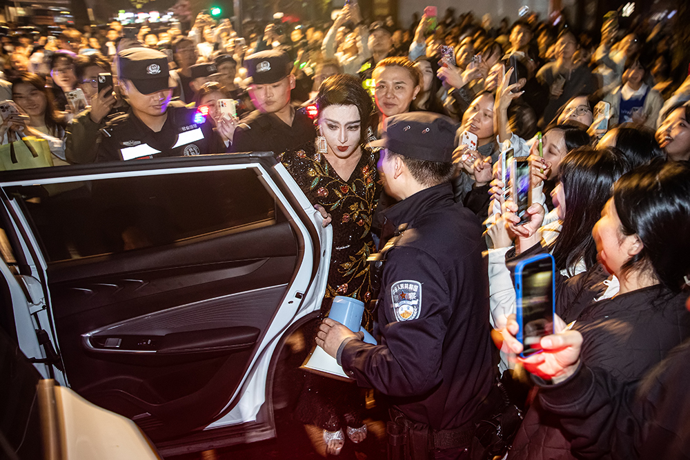 2024年10月27日,杭州,一名装扮成女星范冰冰的男子,被警方带离人群密集区。当晚,一场自发组织的万圣节变装巡游活动在中山北路一带举行,造成人群聚集和交通拥堵。