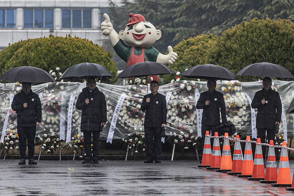 2010年11月16日,上海胶州路余姚路口,两名摄影师要求前来悼念“11·15”特大火灾遇难者的市民江小姐手持菊花,在事发公寓楼下供其拍照,江小姐无奈之下只好配合。此前一天,11月15日14时,上海静安区胶州路一栋高层公寓发生特大火灾,造成58人遇难。