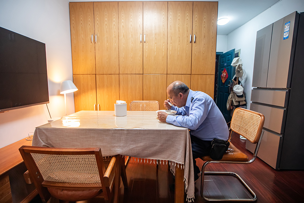 2024年8月30日,杭州,全国劳模、为市民义务修车38年的公交司机孔胜东,在开完最后一趟28路公交车后退休了。从一整天的媒体包围和鲜花掌声中暂别,回家后的第一顿晚饭,孔胜东自己煮了18只速冻水饺,独自吃完。