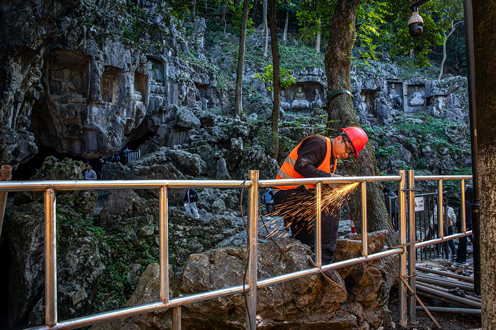 2025年11月13日,杭州,施工人员在灵隐飞来峰景区内安装护栏。12月1日起,灵隐飞来峰景区(含灵隐寺)实行免票政策,游客可通过线上预约方式进入景区。