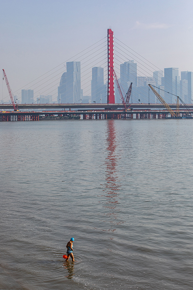 2025年11月22日,杭州,一位市民走进钱塘江准备下水游泳,不远处,建成28年的钱江三桥(西兴大桥)正式开启为期两年的拆除改建提升工程全封闭断流施工。