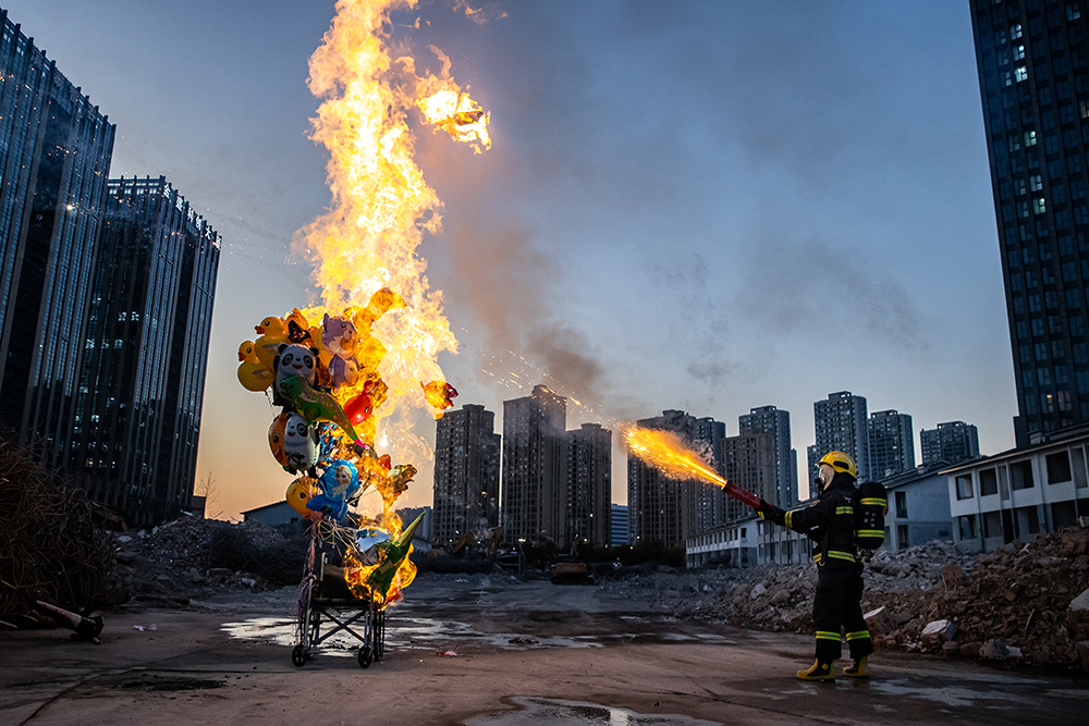2025年1月16日,杭州,消防员进行模拟“加特林”烟花点燃氢气球后发生爆燃的实验,以提醒市民注意春节消防安全。