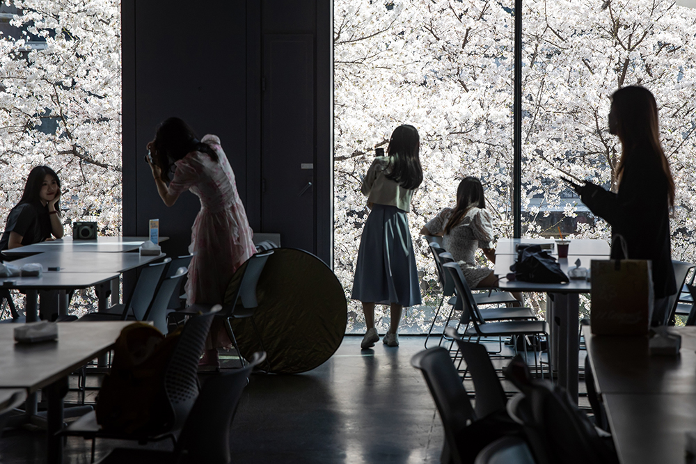 2025年3月25日,杭州,阿里巴巴西溪园区,员工们在拍食堂窗外的樱花。