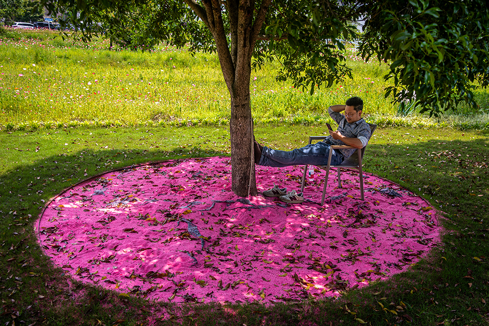 2025年4月26日,杭州建德下涯镇之江村,一名游客在铺满粉色沙子的树荫下休息。