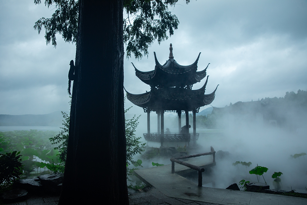 2025年6月11日,杭州,西湖曲院风荷湛碧楼开启人工雾森系统,云雾缭绕,宛若仙境。