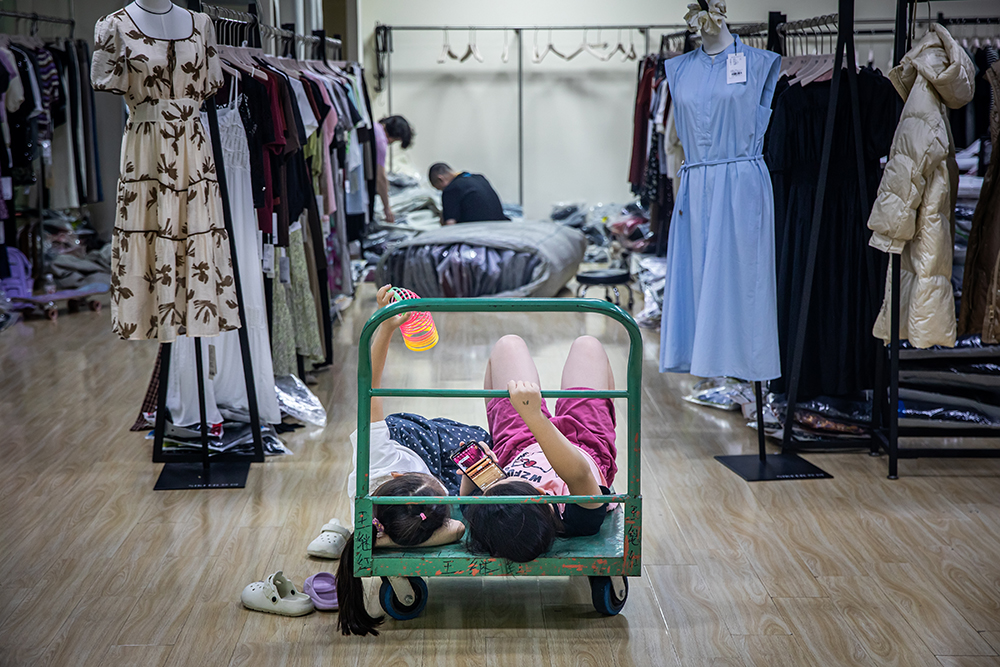 2025年8月8日,杭州国际服装城,两个小女孩躺在一辆运货推车上看手机。每到暑期,很多在这里从事服装鞋帽批发的商户,都会把放假的孩子带来市场,其中有不少是从老家来和父母相聚的“小候鸟”。