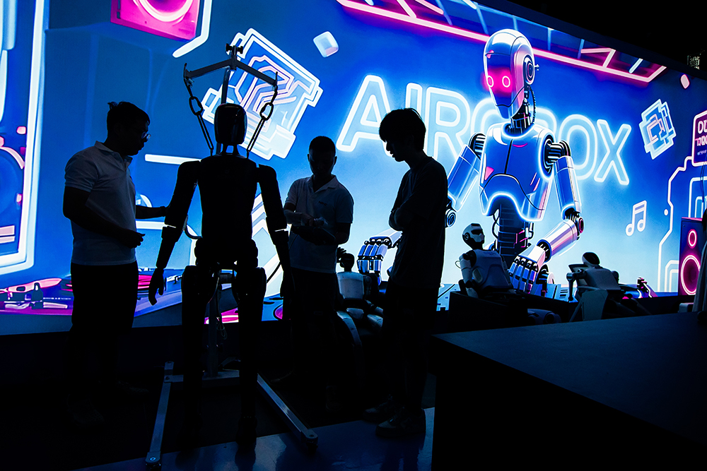 2025年9月29日,杭州,之江文化中心机器人梦工厂,工作人员在调试一台人形机器人。